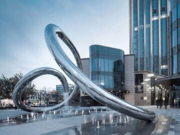 浙江艺通・艺术作为16年不锈钢生产加工厂家,这座天津不锈钢镜面圆环雕塑加工定做项目从深化设计、制作、运输到安装在天津融创星河·和平印历时40天。雕塑以管子弯曲环绕为造型,两头带喷雾效果,兼具现代感与动态美;采用 304 不锈钢,手工锻造钣金加工,表面呈镜面效果,适配商业地产、广场等场景。
