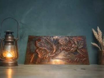 - 锻打錾刻:紫铜板裁剪成型→手工锻打塑形→精细錾刻细节(花瓣、脉络、羽毛等);