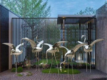 - 手工锻造塑形:工匠按图纸裁切 304 不锈钢板材,通过 “加热软化→手工敲打→定型校正” 步骤,逐一打造每只仙鹤的部件 —— 脖颈用细薄板材锻造(模拟修长感),翅膀用弧形板材敲打(呈现半展的动态),足部做纤细处理(贴合 “仙鹤” 的优雅特质);