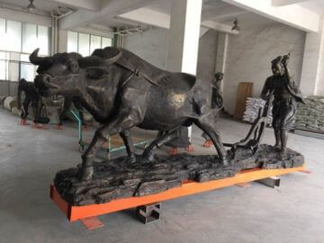 农耕文化牛拉犁铸铜雕塑生产工艺流程为:深化设计→小样→一比一泥塑创作→玻璃钢翻制成型→铸造加工→拼接→打磨→表面处理。